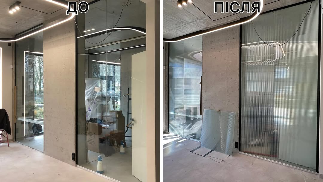 Результат: Приміщення стало менш відкритим для сторонніх поглядів, працівники отримали більше приватності, а фасад зберіг акуратний і професійний вигляд.