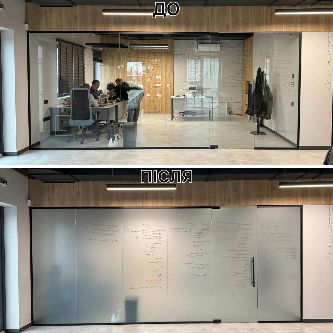 Матові та дизайнерські рішення для приватності, зонування простору та акуратного вигляду скла.